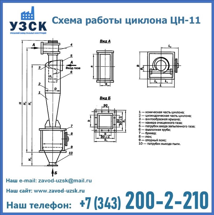 При этом ощутимой разницы в цене между универсальным и узконаправленным, подобранным в соответствии с конкретными техническими требованиями циклоном, нет. Стоимость воздухоочистительного оборудования типа циклон обусловлена маркой и толщиной стали, из которого он изготовлен, сложностью и специфичностью конструкции, наличием дополнительного оснащения (бункер, улитка и другие). При необходимости, на заводе УЗСК в Екатеринбурге будет изготовлен циклон по индивидуальным техническим чертежам заказчика.