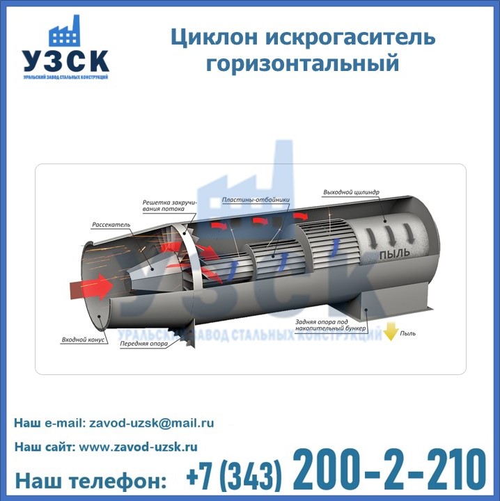 Горизонтальные циклоны-искрогасители ЦГ поставляются в Екатеринбурге в сборке или же транспортными единицами для последующей сборки, если предназначены для работы с большими объемами.