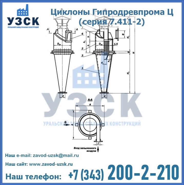 Циклоны Гипродревпрома Ц (серия 7.411-2) высокого качества можно купить в компании «УЗСК» в Екатеринбурге. Наши специалисты предоставят всю необходимую информацию информацию и помогут с выбором модели циклона. Подробные технические характеристики, конструкцию, параметры, ассортимент и стоимость продукции можно также найти на сайте УЗСК.