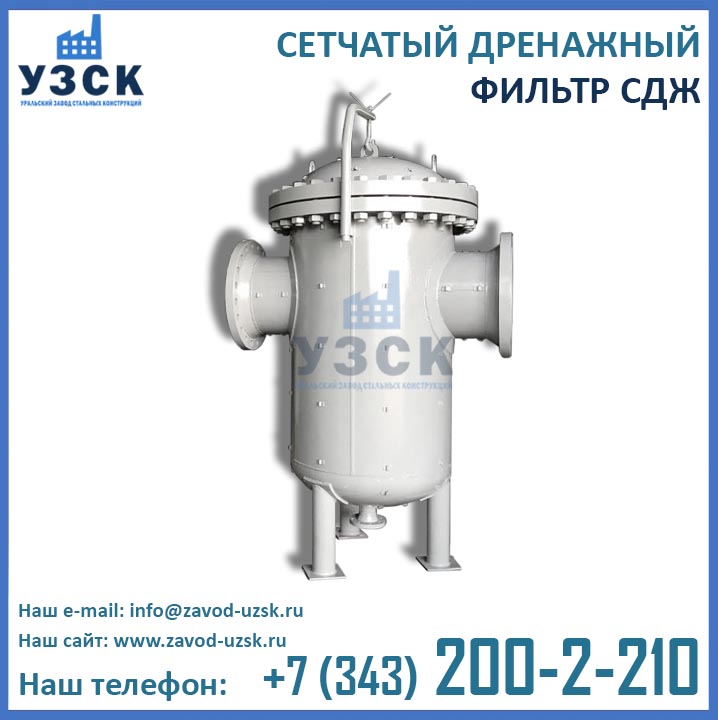 Сетчатые дренажные жидкостные фильтры СДЖ-400 предназначены для фильтрации жидких сред, в том числе нефтепродуктов, от посторонних предметов, примесей, окалины, механических частиц и прочих загрязнений. Дренажный фильтр СДЖ Ду 400 мм в Екатеринбурге высоко востребован в газовой, нефтяной, химической, нефтеперерабатывающей, и других сферах промышленности. В зависимости от модели, фильтр СДЖ Ду400 эксплуатируется в трубопроводных системах с максимальным давлением Ру 1,6 / 2,5 / 4,0 / 6,3 МПа (16 / 25 / 40 / 63 кгс/см2) и обозначается СДЖ-400-1,6 / СДЖ-400-2,5 / СДЖ-400-4,0 / СДЖ-400-6,3.
