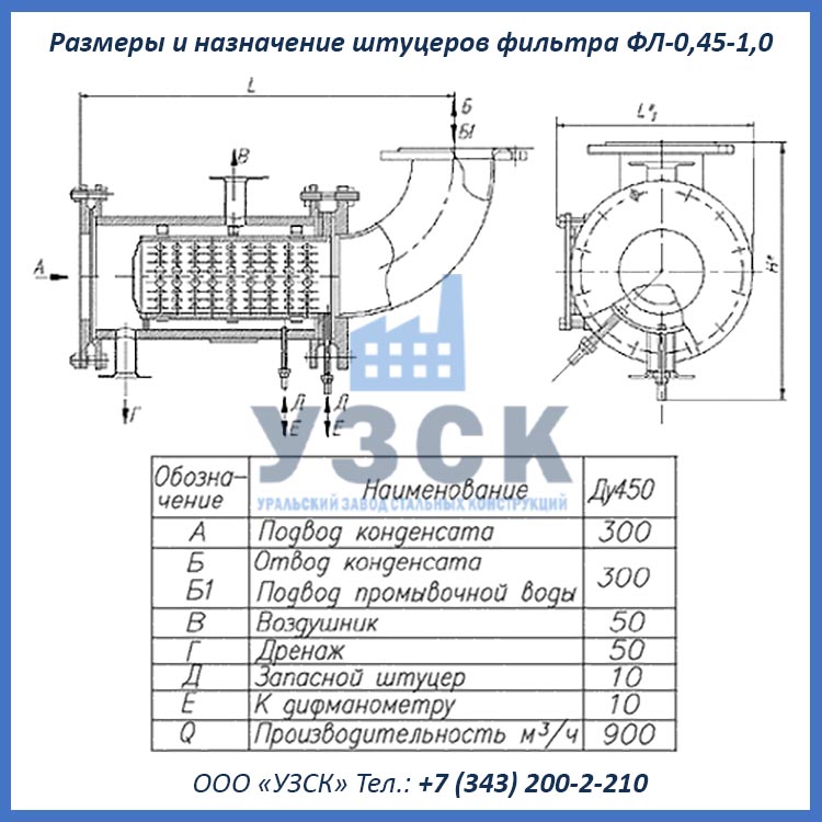 Фильтр ФЛ-0,45-1,0 представляет собой фильтр-ловушку ионитов с диаметром условного прохода 450 мм и устанавливаются на участок трубопровода после ионитного фильтр. Назначением фильтра ловушки ФЛ-0,45-1,0 является удаление из уже очищенной воды случайно попавших частиц фильтрующих материалов (ионитов).