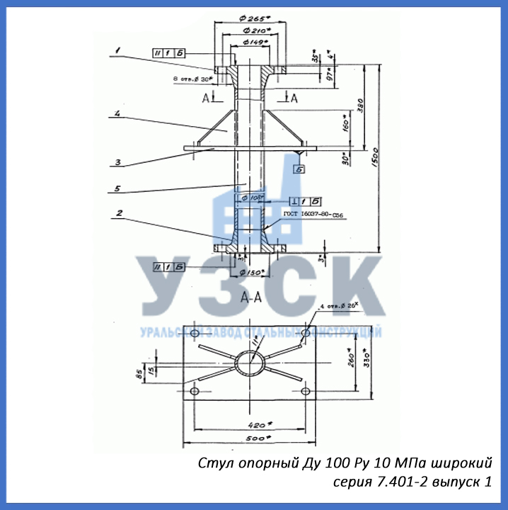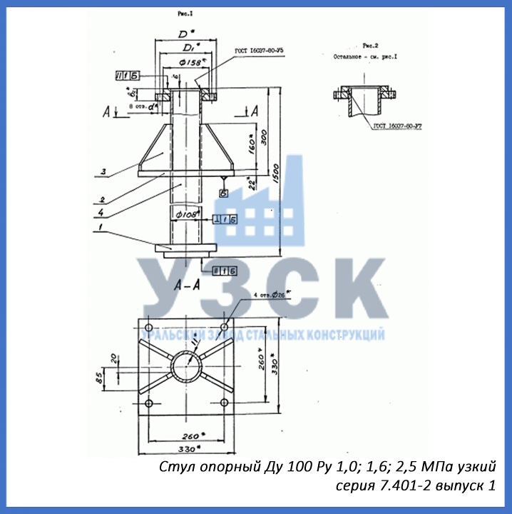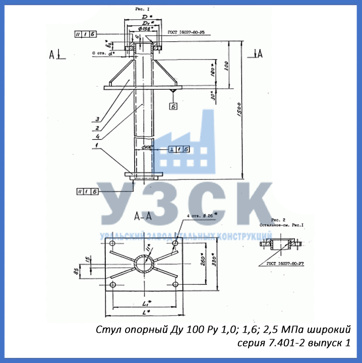 - серия 7.401-2 выпуск 1 – стул опорный узкий Ду 100 мм (СОУ-100), стул опорный широкий Ду 100 (СОШ-100);