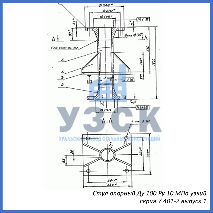 Уральский Завод Стальных Конструкций осуществляет производство опорных стульев высокого давления по серии 7.401-2 любого диаметра от Ду 100 до Ду 400 мм. Производственные площади завода «УЗСК» оснащены необходимым современным оборудованием, таким как токарные, сверлильные, фрезерные и лентопильные станки, оборудование для плазменной резки, листогибочные трехвалковые машины, гильотины, сварочные аппараты и др). В составе завода работает высококвалифицированный инженерно-конструкторский отдел и лаборатория неразрушающего контроля, что позволяет ООО «УЗСК» выпускать стулья опорные высокого качества в кратчайшие сроки, как типового исполнения, так и нестандартных размеров по чертежу заказчика. Инженеры завода также разрабатывают техническую документацию и чертежи на основе тех. Задания заказчика.