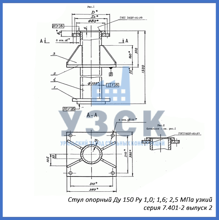 В выпуске 2 серии 7.401-2 представлены стулья опорные диаметром Ду 150 мм с рабочим давлением от 1,0 до 10 МПа.