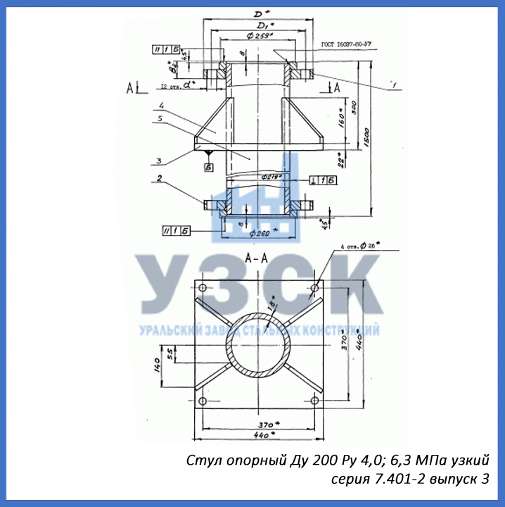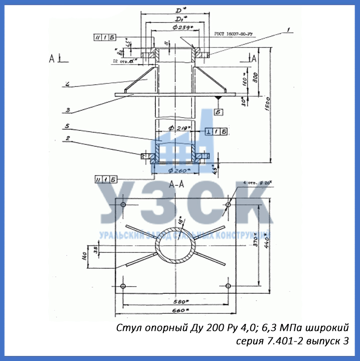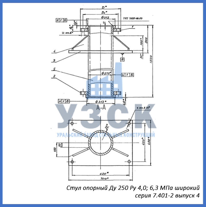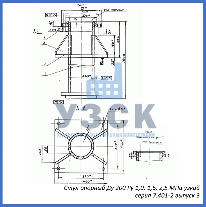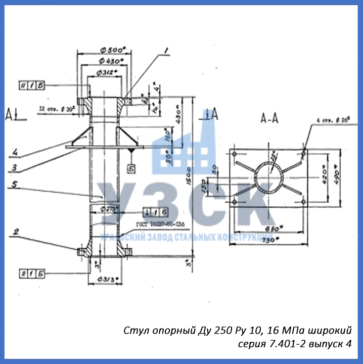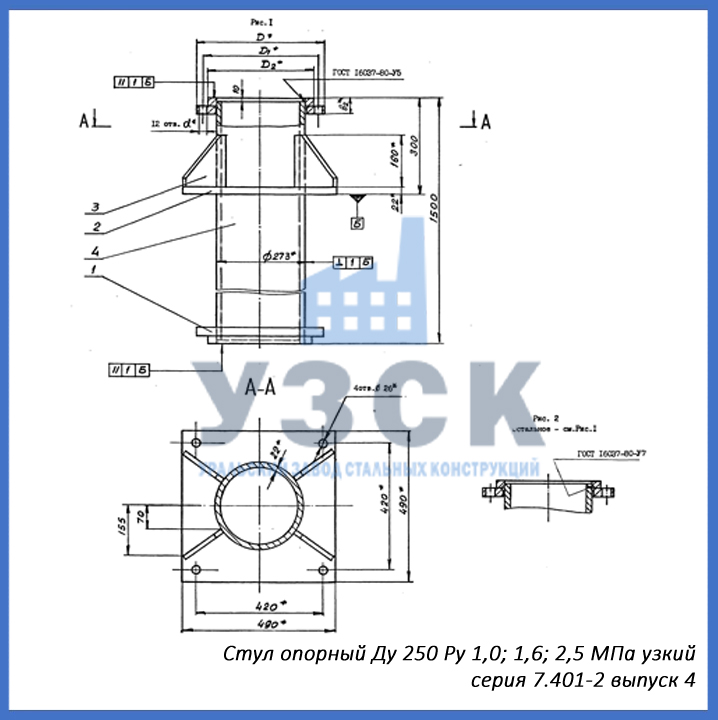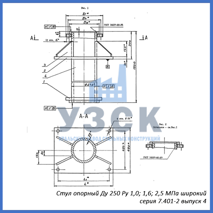 - серия 7.401-2 выпуск 4 – стул опорный узкий Ду 250 мм (СОУ-250), стул опорный широкий Ду 250 (СОШ-250);