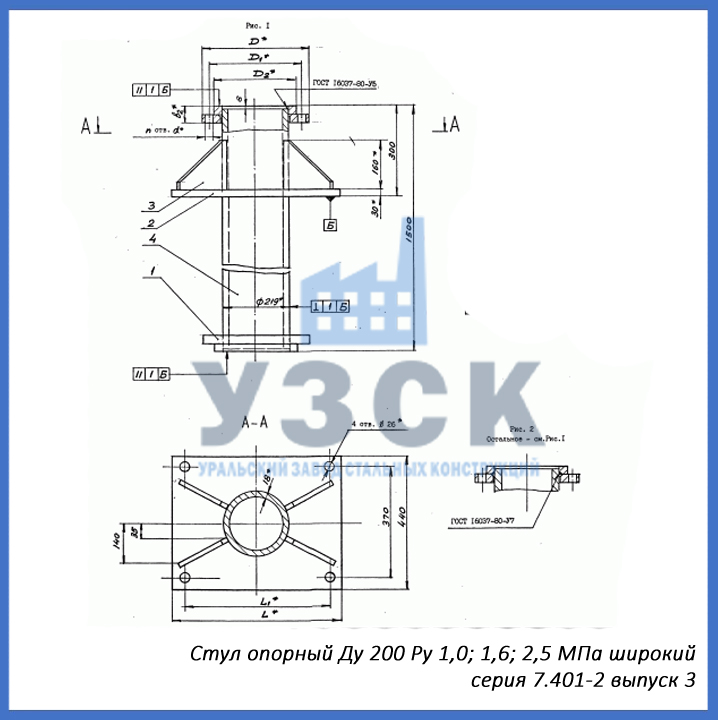 Серия 7.401-2 имеет несколько выпусков, в каждом из которых представлены узлы крепления трубопроводов разного диаметра от Ду 100 до Ду 400, рассчитанные на рабочее давление от Ру 10 до Ру 160 кгс/см2. Завод «УЗСК» осуществляет изготовление опорных стульев для нефтедобывающей промышленности в соответствии со следующими выпусками: