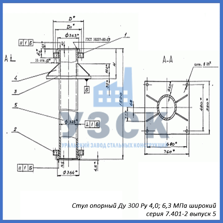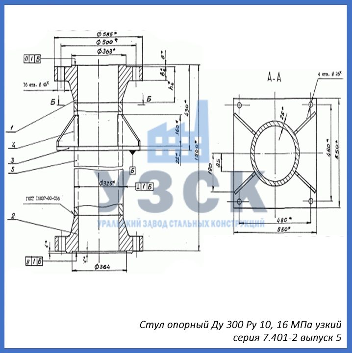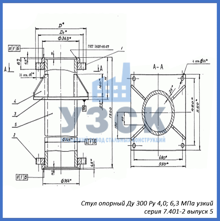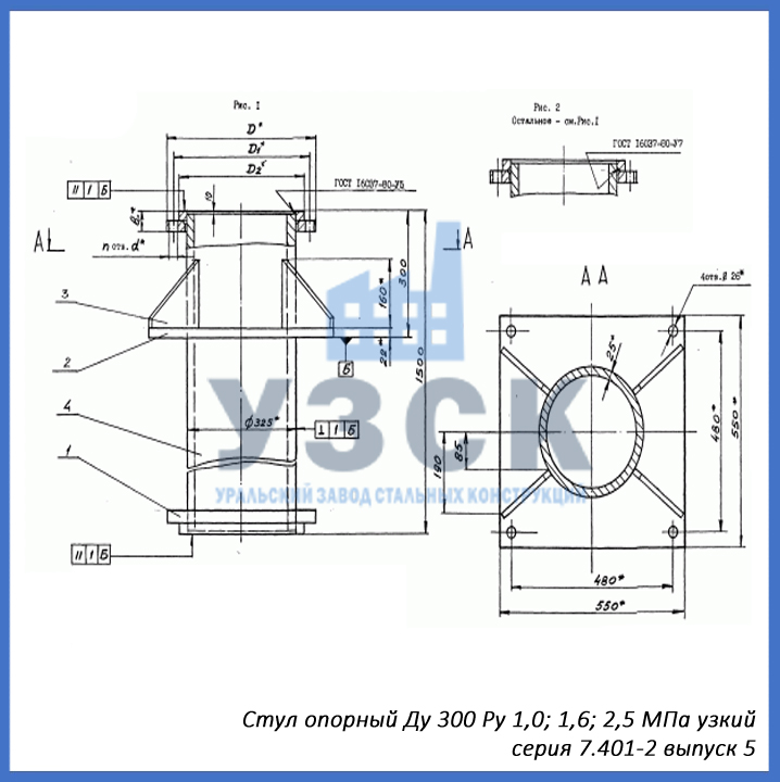 - серия 7.401-2 выпуск 5 – стул опорный узкий Ду 300 мм (СОУ-300), стул опорный широкий Ду 300 (СОШ-300);